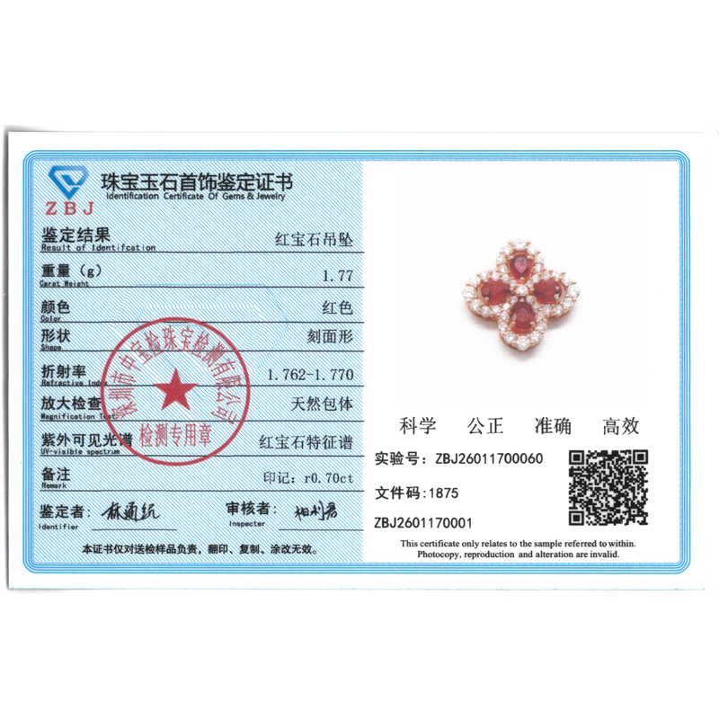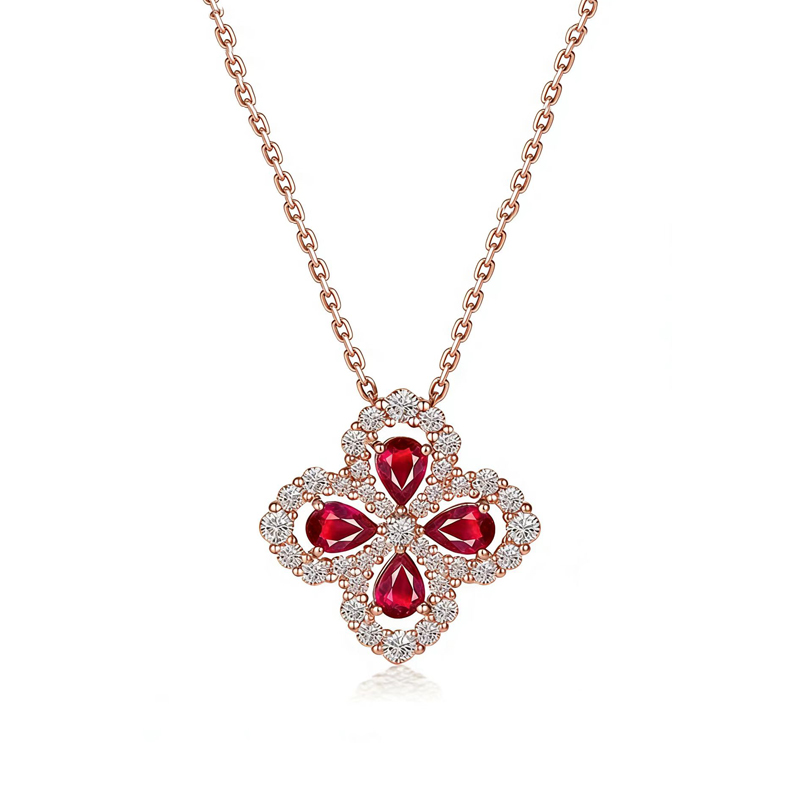 四叶草的每一瓣叶片,皆被赋予深意:以4颗珍稀梨形红宝石为主石,三爪镶嵌的璀璨光芒,恰似爱意被温柔托举。红宝石如炽热心跳,诉说此生唯一的挚爱誓言。主石梨形切割的弧线流淌着古典诗意,火彩随光影流转,仿若命运指引下不期而遇的怦然心动。