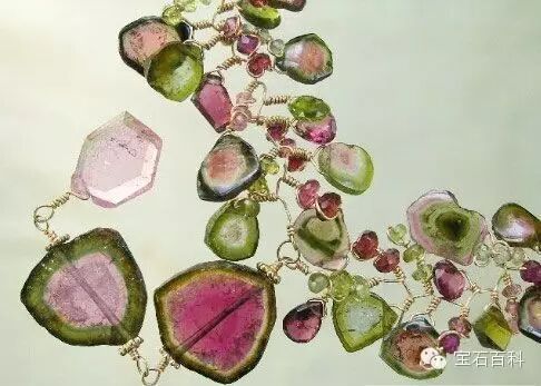 往往沿晶体的长轴方向分布的色带(双色、三色和多色),或呈同心带状分布的色带。当具有绿色和红色两种颜色,绿色在外围,红色在中心,就像西瓜一样,外面是绿色,里面的芯是红色的,就叫做“西瓜碧玺”。西瓜碧玺是在一颗晶石里面,数量稀少,故价格较贵。