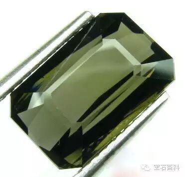 由于含铁、铬和钒元素而呈绿色,在可见光区域内,主要存在420nm、718nm的吸收,与Fe2+和Fe3+离子对间的电荷转移跃迁有关。另外,Co3+和Cr3+的d电子跃迁也会引起吸收导致绿色。其多色性明显,为浅绿色和深绿色。双折射率高,通常为0.018,最高为0.039。