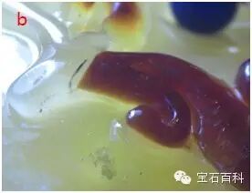 我们用放大镜仔细观察贴皮琥珀的俏色部分可以发现,天然皮色或烤色皮色巧雕部分颜色渐变呈过渡状,而人工“贴皮”色块与主体之间颜色界限清晰无过渡,放大观察还可见粘和处不紧密残留空气造成的斑驳状以及粘接物中残留浑圆状气泡。