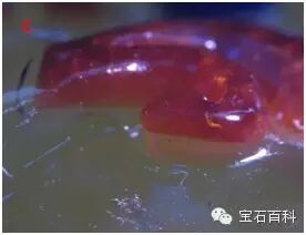 而且这些贴皮琥珀中往往伴随充填处理存在,以掩盖其充填处理的痕迹。并且很多“贴皮”部分覆盖在充填物上部,来掩盖充填痕迹。所以我们常常放在紫外荧光灯下,充填以及“贴皮”的痕迹会变得更加明显:充填部位荧光较暗,而正常天然琥珀荧光常呈强蓝白色,两者之间界限明显。下图所示贴皮部分非常暗淡!