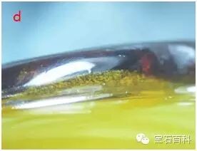 放大检查(图a“真皮”颜色变化呈过渡状,b-d“假皮”琥珀颜色变化截然,可见拼合痕迹以及拼合缝残留气泡)