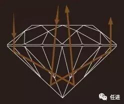在这样的钻石里面,很大一部分的光线会走向这样一条道路。光线两次碰到钻石亭部与空气的交界线,都发生了全内反射,最终只好从钻石的冠部回到了空气中,成为了那些“闪瞎”我们的光芒。