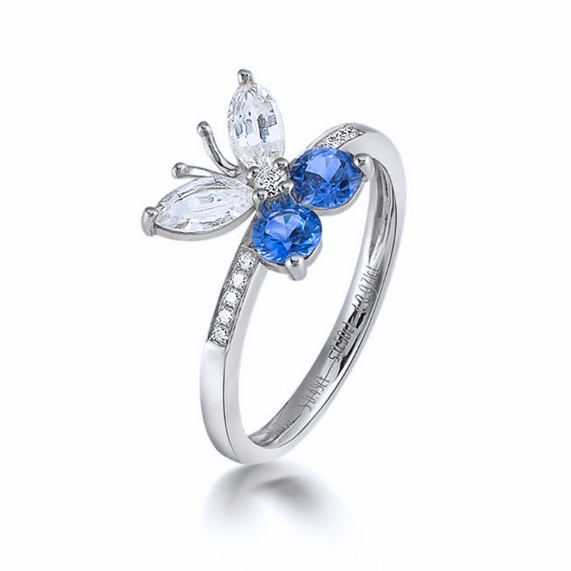 设计师以精密解剖学视角解构蝴蝶的优雅形态,18K白金戒圈如蝶翼舒展时的气流轨迹,以极简线条勾勒自然张力。戒面中央,四颗蓝宝石构成蝶翼的灵魂:两枚马眼形无色蓝宝石以修长轮廓向上延伸,似晨光穿透薄翼;两枚圆形蓝色蓝宝石则以深邃色泽沉淀时光,切割面折射出星河般的光晕。蝶身中央镶嵌一颗圆形钻石,包镶工艺令其如晨露悬停于花蕊,交织出生命的炽热脉络。触角以18K白金微雕成螺旋细珠,轻盈探向虚空,仿佛下一秒便要翩然起舞。