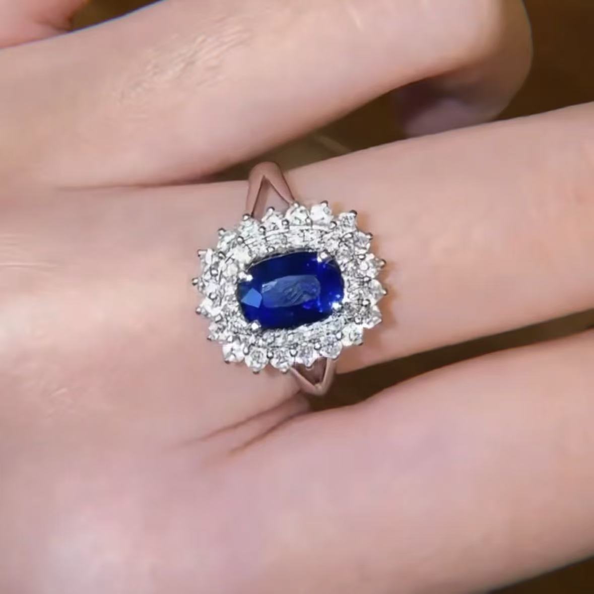 7.1mm×4.2mm的椭圆切割蓝宝石占据视觉重心,外围两圈共36颗圆钻以精确间隙密镶排列,创造出银河环绕恒星的震撼效果。不同于传统群镶的繁复堆砌,我们采用「雪花矩阵」镶嵌工艺,每颗钻石的亭角角度经计算机模拟校准,确保从任何角度观赏都能捕捉到最耀目的火彩喷发。