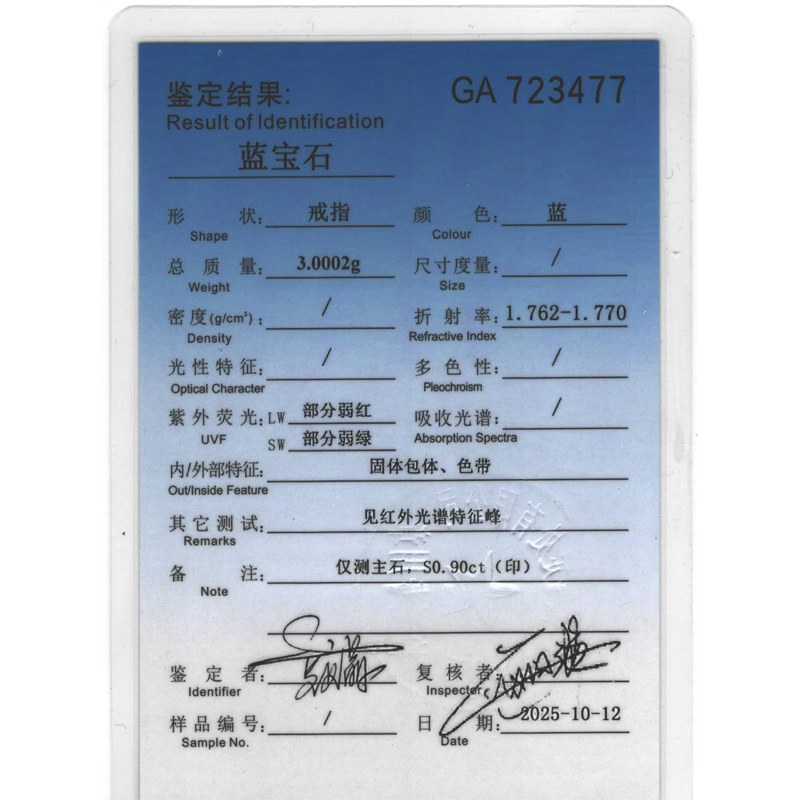 3.01克拉无烧皇家蓝蓝宝石 GRS证书