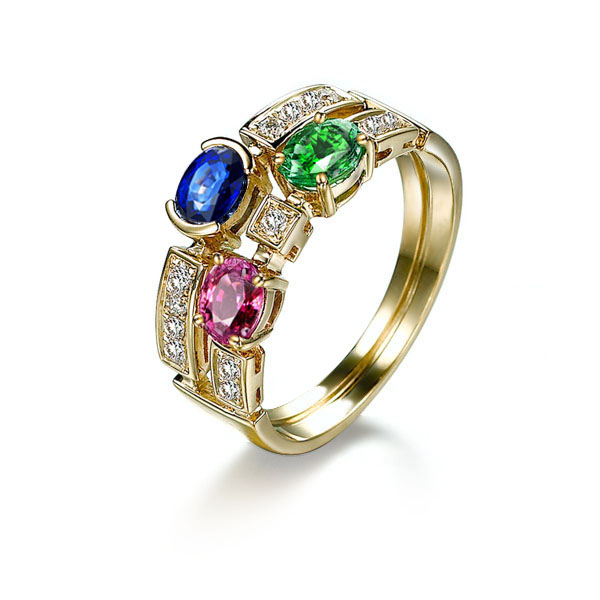 ·色彩革命:突破传统钻戒的单一宝石桎梏,以蓝、粉、绿的冷暖碰撞交融,形成强烈的视觉张力,却又在黄金的调和与钻石的辉映下归于和谐统一,展现令人惊叹的配色艺术。
