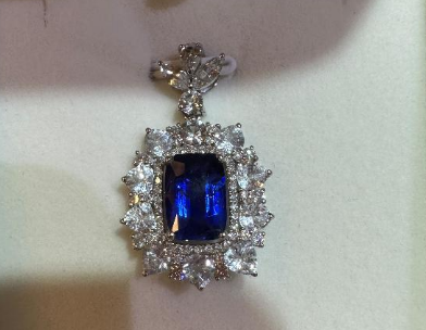印度克什米尔蓝宝石。颜色呈矢车菊的蓝色,也就是微带紫的靛蓝色。颜色的明度大,色鲜艳。有雾状的包裹体的具乳白色反光效应。一直被誉为蓝宝石中的极品。