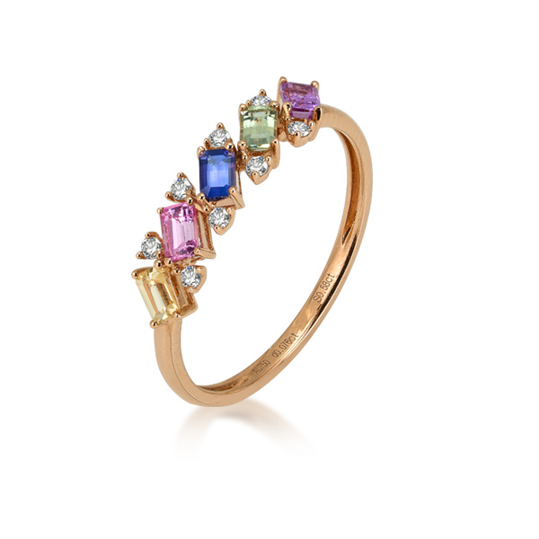 戒托的设计更是点睛之笔。精致的金属材质,经过精心打磨,散发着柔和的光泽,与彩蓝宝的璀璨相得益彰。戒托上还镶嵌着细碎的钻石,如同点点繁星围绕着彩蓝宝这颗璀璨的“星辰”,既增添了戒指的华丽感,又突出了这些彩色蓝宝石的主角地位,无论送礼还是自戴皆可。