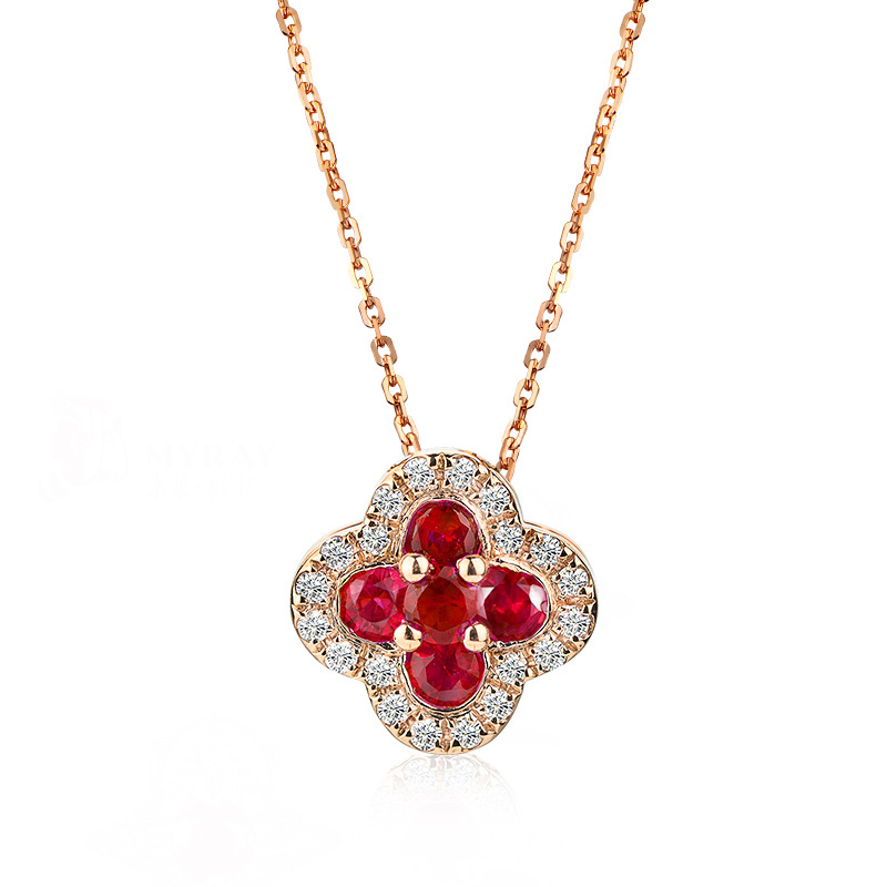 甄选温润醇厚的18K玫瑰金,勾勒出四叶草流畅饱满的轮廓。这抹如暖阳亲吻过的金色光泽,赋予造型以生命的温度与丰盈。叶片边缘,20颗精选钻石以精妙绝伦的铲边镶工艺紧密排列,璀璨星芒精准勾勒幸运边界。而叶心之处,5颗浓郁深邃的红宝石如凝结的朱砂,密镶其间。红宝石的热烈与钻石的纯粹,在18K金的温暖怀抱中交融,碰撞出精致典雅与华贵浪漫的极致平衡,诉说着对丰盛人生的热烈向往。