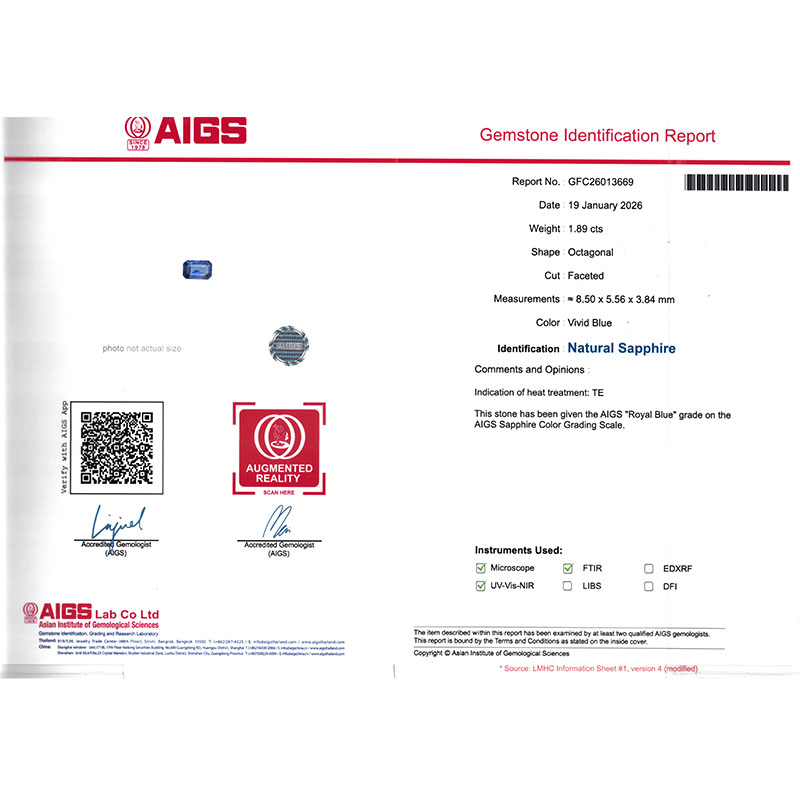 AIGS认证皇家蓝。 完美高品质、全净清澈透明玻璃体,颜色均匀火彩璀璨,没有保重标准祖母绿形状切割,尺寸约8.5*5.5*3.84现货品鉴