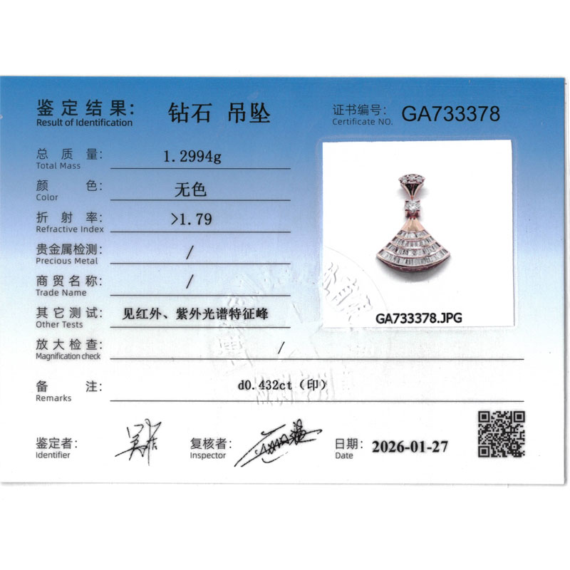 吊坠上半部的倒立银杏叶,以铲边镶工艺锚定三颗圆形明亮式切割钻石,中央过渡处一颗主钻似露珠垂坠,形成视觉重心。