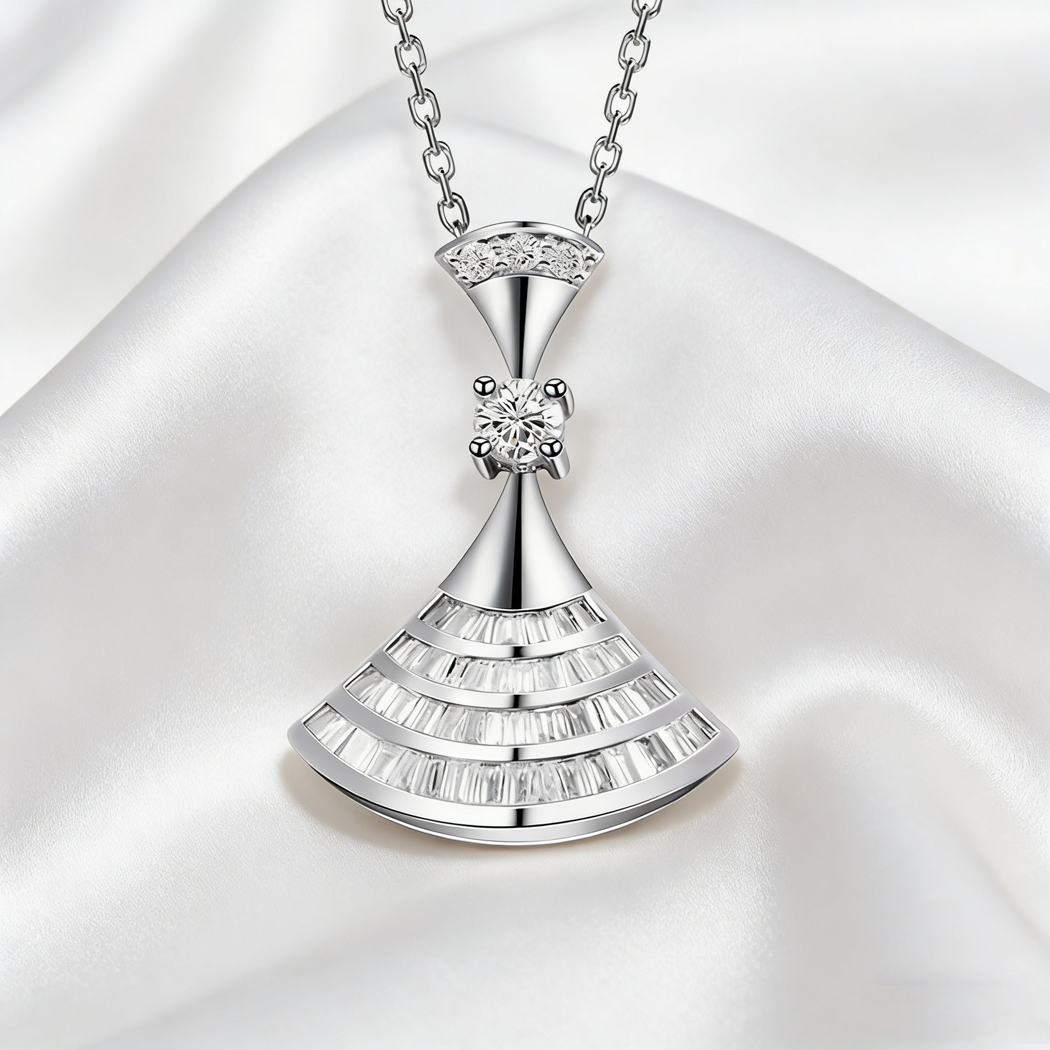 这款吊坠的尺寸约14mm×19mm,整体造型宛如两片银杏叶再时光中温柔相拥,中间包裹着一颗熠熠生辉的圆钻,恰似星辰落入叶间。它的扇形轮廓复刻了银杏叶舒展的自然弧度,用18K白金的纯净光泽包裹匠心工艺,让每一寸线条都流淌着东方美学的婉约与西方珠宝的锋芒。