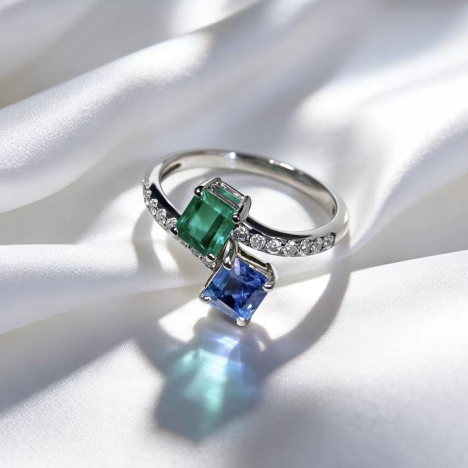 天然蓝宝石祖母绿钻戒