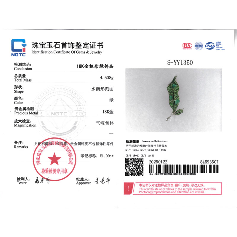 - 首饰证书号:NGTC S-YY1350