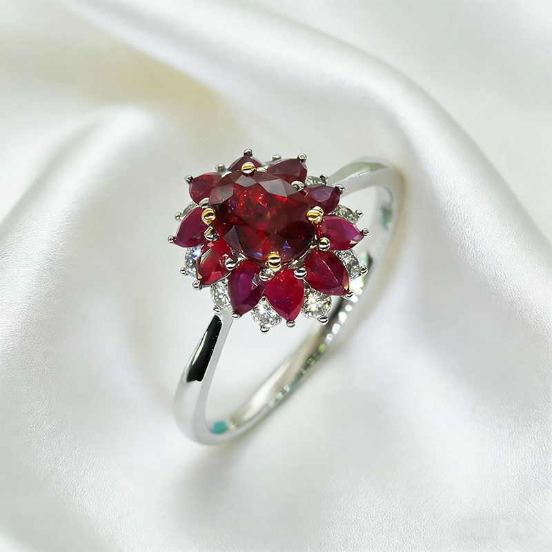红色是中国人认为喜庆的颜色,代表着爱、力量和热情,也象征着生活的红火。在迷人的彩色宝石王国里,红宝石当仁不让的被公认为宝石之王。天然红宝石大多来自亚洲(缅甸、泰国和斯里兰卡)、非洲和澳大利亚,美国蒙大拿州和南卡罗莱那州也有一点。天然红宝石非常少见珍贵,工业用红宝石都是人造的。